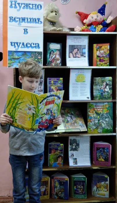 «Пока ребенок с книгой, его душа «думает!» — это слова замечательной писательницы Тамары Крюковой, которой 14 октября исполняется 65 лет. С её творчеством знакомы и взрослые, и дети. Хорошая книга – отличный друг. В этом убедились читатели, которые познакомились с изданиями, представленными на выставке «Нужно верить в чудеса». Тамара Шамильевна пишет сказки для малышей, повести для детей младшего школьного возраста, сборники стихов, фантастику и приключения для подростков, молодёжные романы.
