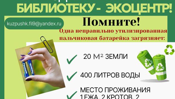 Библиотека-экоцентр объявляет о старте ежегодной экологической акции «Сдай батарейку в библиотеку-экоцентр!». Одна выброшенная пальчиковая батарейка загрязняет тяжёлыми металлами около 20 квадратных метров земли. Чтобы этого не допустить, приглашаем жителей Кузнецка и Кузнецкого района присоединиться к...