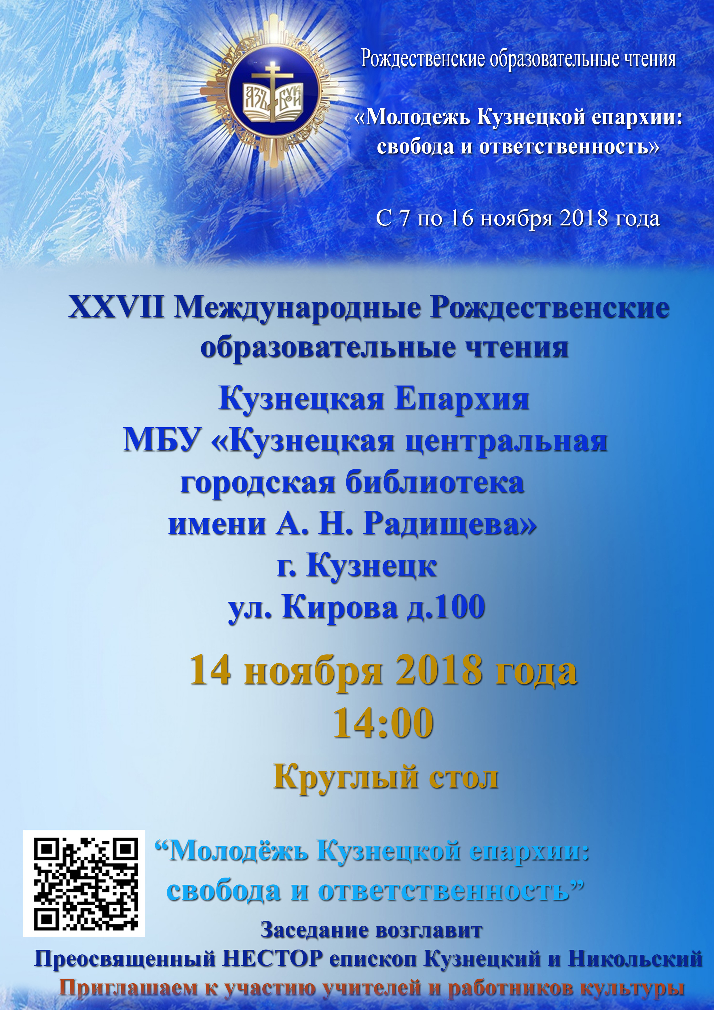 14 ноября в 14.00 состоится заседание Круглого стола в центральной городской библиотеке им. А.Н. Радищева, где примут участие представители Епархии, городской и районной администраций в сфере культуры, образования и работы с молодёжью. Заседание возглавит Преосвященнейший Нестор, епископ Кузнецкий и Никольский