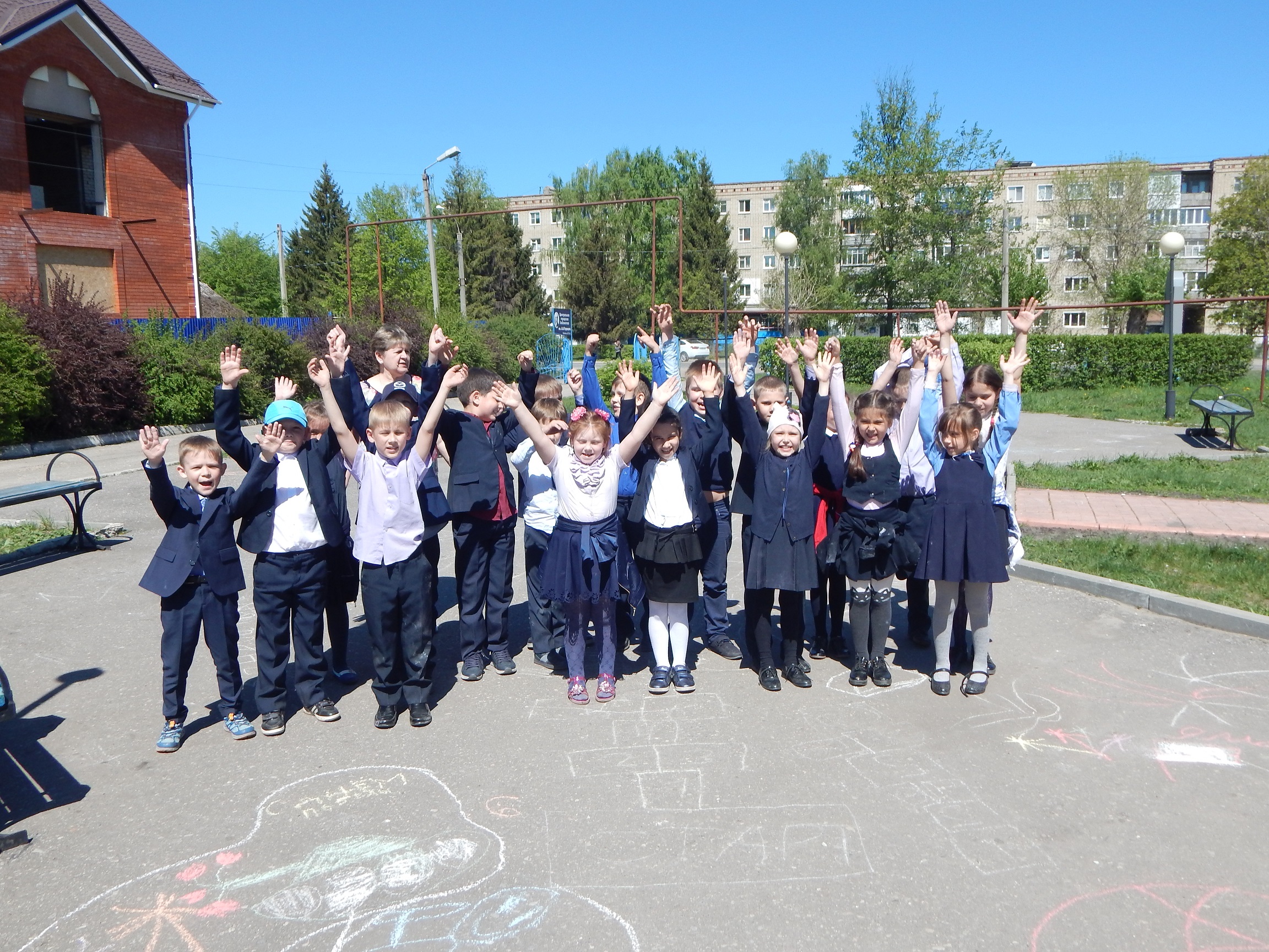 Первоклассники лицея №21 внесли свой маленький вклад за мир во всем мире, и с большим увлечением, старательно выводили мелом на асфальте символ Победы — георгиевскую ленточку, рядом с изображением танка — цветы, а также салют и воздушные шары. Свои рисунки дети подписывали: «Мы за мир!», «С днём Победы!»