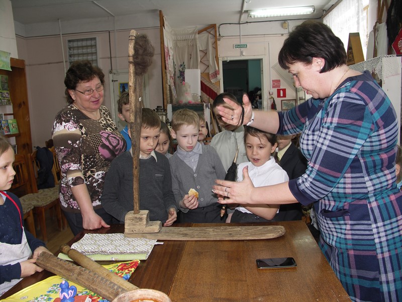 А помогли им устроить путешествие во времени богатства народной речи – загадки, пословицы, поговорки и экспонаты мини-музея. Ребята с интересом слушали рассказ о предметах старины, быте крестьян, традициях старой России. Быт в старину был очень тяжёл. Невозможно объяснить детям значение давно вышедших из употребления слов: веретено, прялка, коромысло, люлька, крынка и других. Только увиденные своими глазами, обыгранные в процессе игры, эти предметы становятся узнаваемыми. Мальчишки и девчонки были не просто сторонними наблюдателями, а непосредственными участниками тех событий, о которых рассказывалось. Здесь можно было не только посмотреть, но и подержать в руках предметы национального быта, погладить бельё с помощью рубеля, посадить в печку чугунок или просеять муку для выпечки каравая. А сколько полезного ребята узнали о русской печке, чугунке, ухвате, утюге с углями, кочерге, деревянной ложке, хлебной лопате, рушниках.