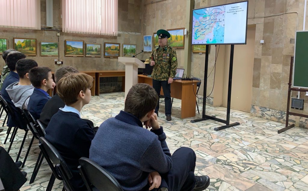В центральной библиотеке состоялась встреча учеников лицея № 21 с председателем общественной организации «Совет ветеранов пограничных войск г. Кузнецка» О.В. Герасимовым и членами общественной организации А.А. Лапшиным, Н.П. Шиндиным. В начале мероприятия ребята посмотрели документальный фильм «Афганистан. Краткая история войны». Затем Олег Валентинович Герасимов поделился воспоминаниями о годах службы на границе, привел примеры солдатской взаимовыручки и подчеркнул важность сохранения патриотизма и взаимопомощи во всех ситуациях. Алексей Андреевич Лапшин поделился с ребятами воспоминаниями о советско-китайском пограничном конфликте, участником которого он был, на острове Даманском на реке Уссури.