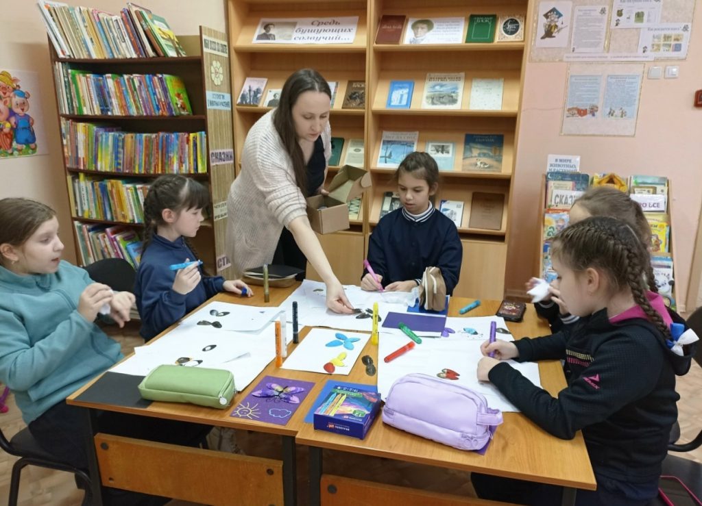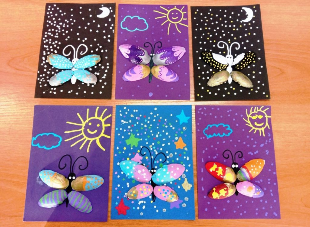 В начале занятия библиотекарь показала девочкам россыпь раковин, собранных на берегу Никольского пруда, и рассказала о беззубке — двухстворчатом моллюске, чьи прочные и красивые раковины часто используют в декоративном творчестве. Яркий пример — аппликация «Бабочка». Для её создания нужно раскрасить внешнюю сторону раковин акриловыми красками и приклеить их на картонную основу.