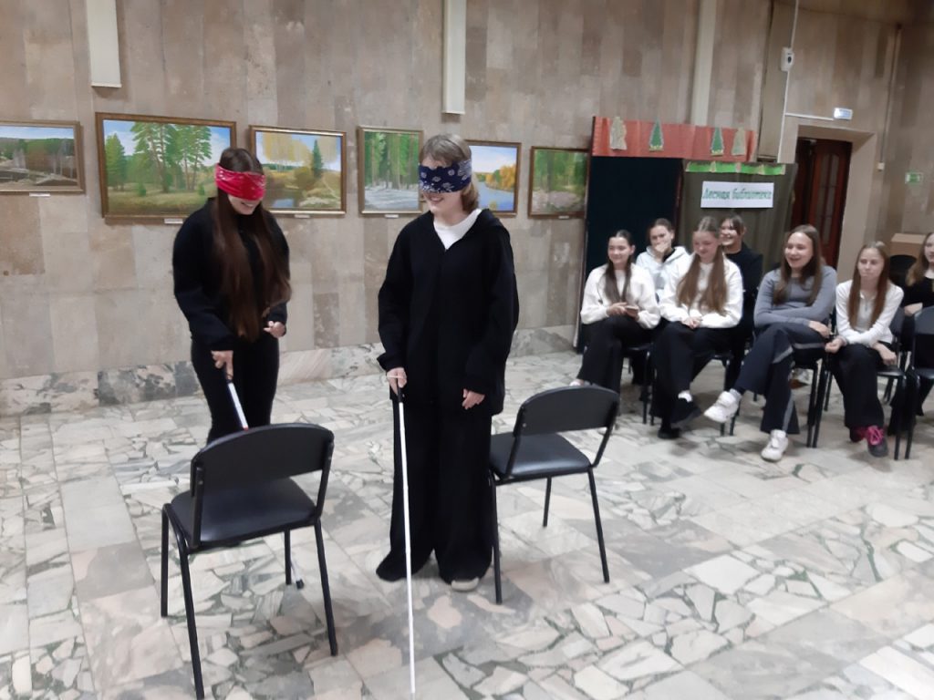 Мероприятие началось с ознакомления присутствующих с историей этого дня, и его главным символом – белой тростью. Ведущая попросила школьников стать «незрячими» и пройтись по залу с тростью с завязанными глазами. После этого они поделились впечатлениями, как им стало страшно и их объяло чувство безысходности, когда исчезла картинка окружающего их мира…