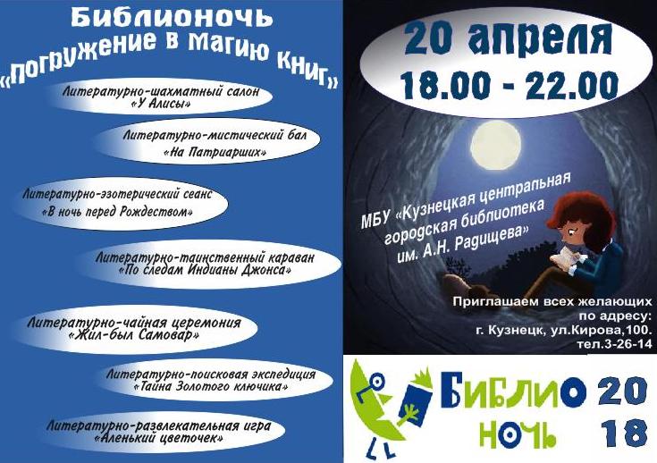 20 апреля с 18 до 22 часов Кузнецкая центральная городская библиотека им. А.Н. Радищева приглашает всех желающих на свою главную ночь в году.