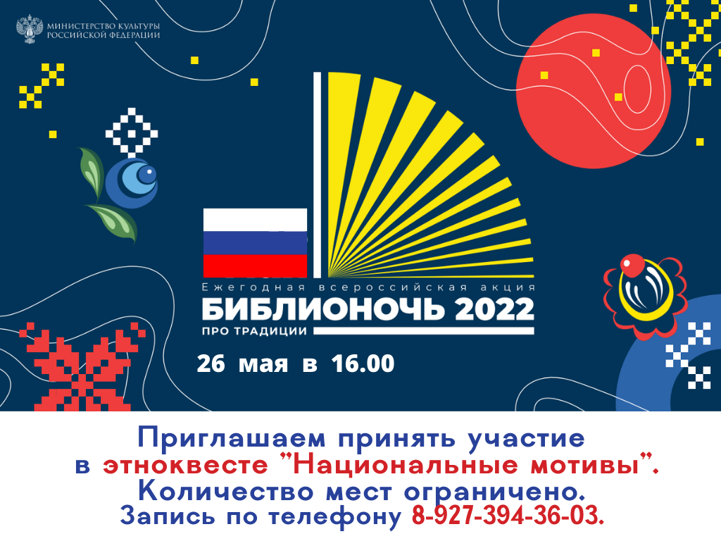 Кузнецкая центральная городская библиотека им. А.Н. Радищева приглашает кузнечан принять участие в этноквесте «Национальные мотивы» в рамках ежегодной Всероссийской акции «Библионочь-2022».