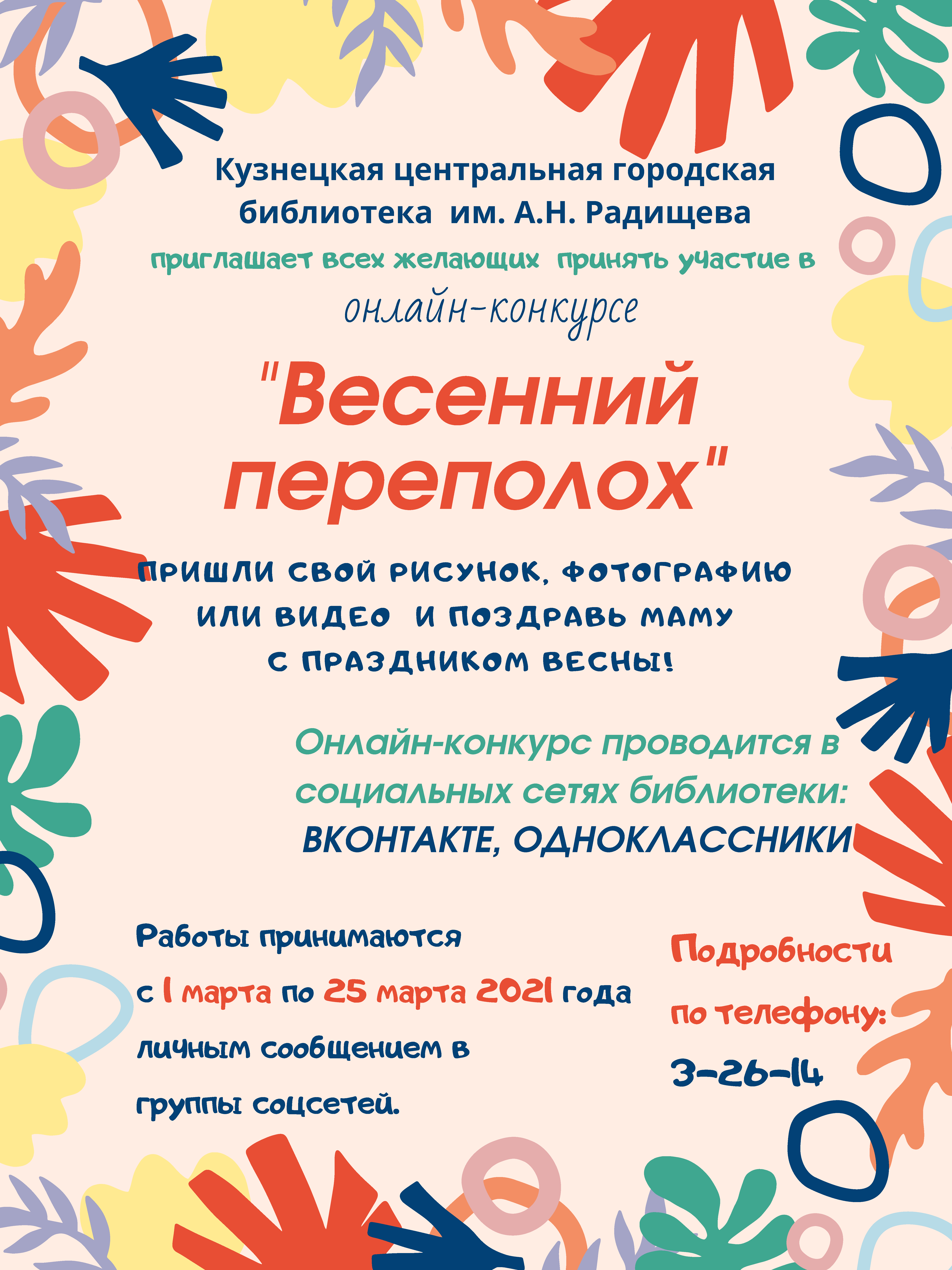 Кузнецкая центральная городская библиотека им. А.Н. Радищева приглашает кузнечан принять участие в онлайн-конкурсе «Весенний переполох». Конкурс приурочен к празднованию Международного женского дня 8 Марта и посвящён любимым мамам.
