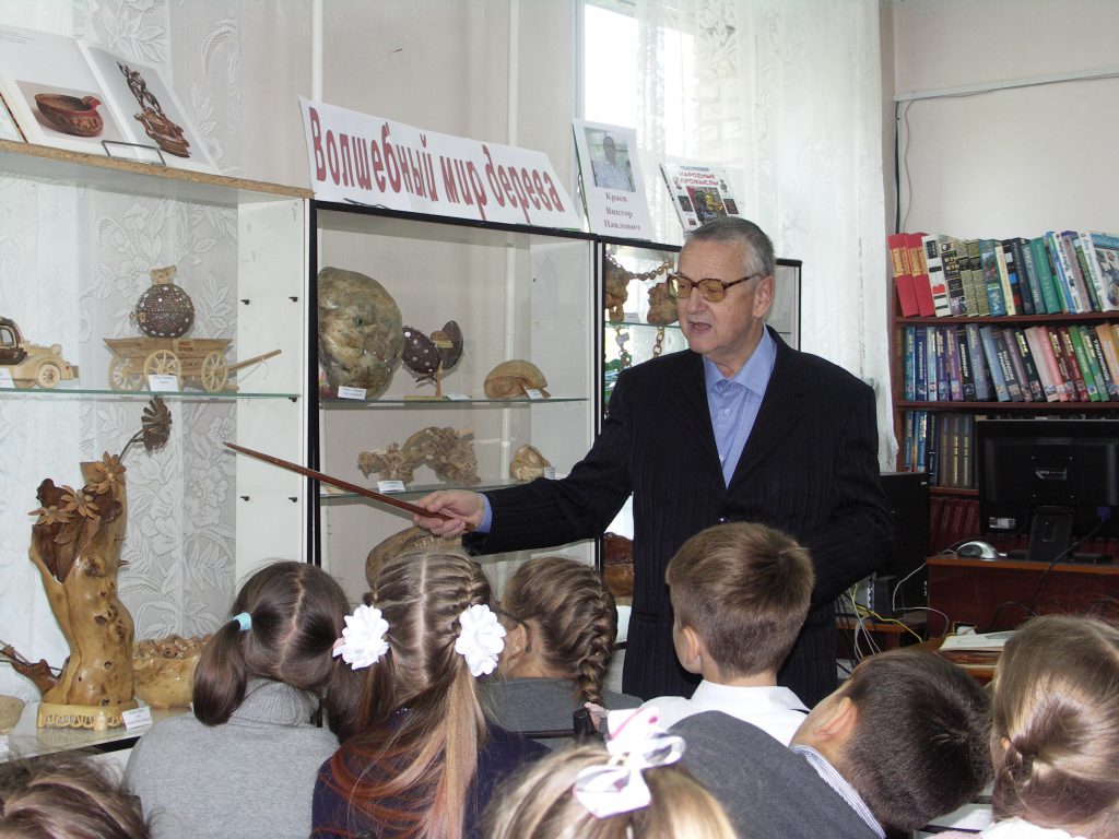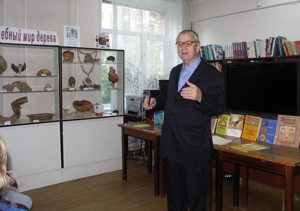 В филиале № 5 для школьников были организованы встречи с кузнецким умельцем, мастером резьбы по дереву В.П. Краевым.