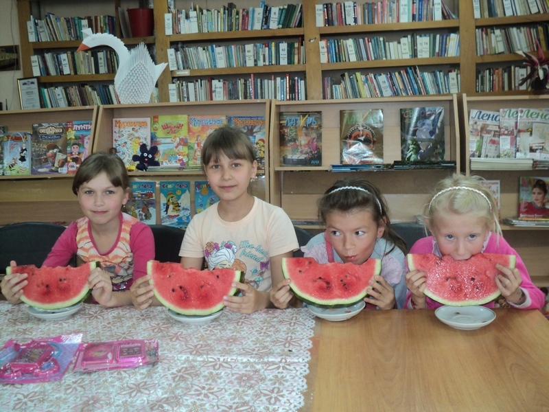 Путешествие ребят по «огороду» началось с «Загадок на грядке», они легко отгадывали всем известные корнеплоды, овощи и даже называли блюда, которые готовят их родители. Далее участники игры соревновались в отгадывании «Загадок на ветках». «Смородина! Крыжовник! Барбарис! Вишня! Виноград! Слива! Абрикос! Яблоки! Лимон!, Груша!, Апельсин!, Банан!, Мандарин!» — громко и радостно звучали ответы участников. А вот на «Цветочной поляне» загадки оказались сложнее. Но, тем не менее, хорошо известные всем розы, ромашки, ландыши, нарциссы, тюльпаны, пионы, астры, гладиолусы были угаданы правильно. В итоге наибольшее количество баллов заработал Миша Бородин – знаток фруктов, овощей, цветов, активный мамин помощник в огородных делах. Все участники игры-путешествия получили призы и угостились самой большой и сочной ягодой – арбузом.