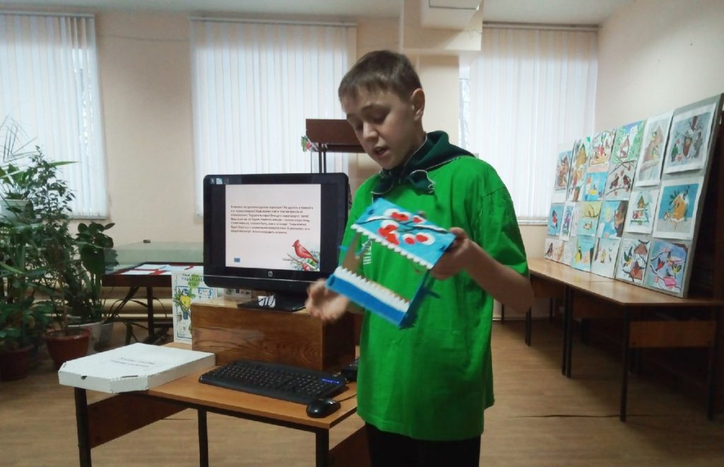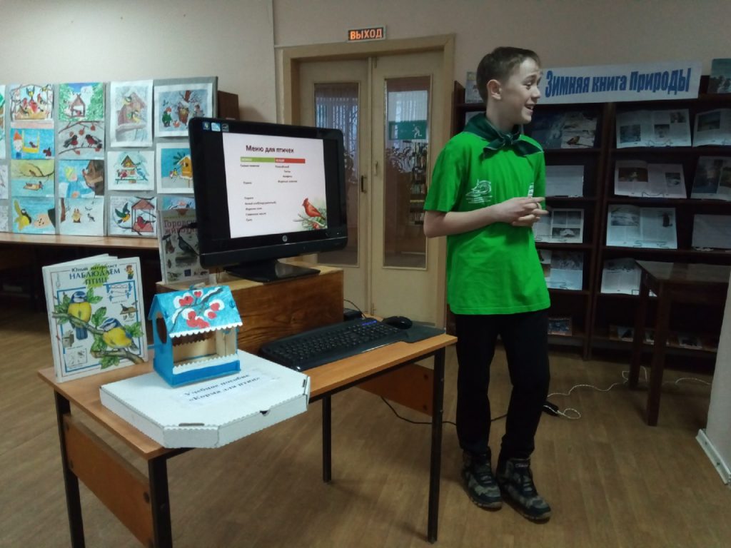 Дмитрий – восьмиклассник школы № 5, активный участник волонтёрского отряда «Зелёный дозор». Любит природу, интересуется экологией, а с недавних пор стал активно участвовать в социально-экологических акциях, научно-исследовательских проектах по биологии, записался в библиотеку-экоцентр. На встрече юноша рассказал о разработке своего проекта по поддержке видового разнообразия птиц в зимнее время года в условиях малых городов. «Мало повесить кормушку, – считает он, – надо организовать правильную и регулярную подкормку». Для этого Дима изучил рекомендации орнитологов, провел мониторинг посещений кормушек птичками при разном температурном режиме, сравнил, какие виды корма любят разные птицы, смастерил пособие с образцами круп, семян и вышел с предложением провести классные часы в начальной школе по особой методике. Эковолонтёр сопровождал свой рассказ мультимедийной презентацией, видеосюжетами, викторинами, ответил на вопросы «надеждинцев», поблагодарил сотрудников библиотеки за предоставленные книги, буклеты для своих выступлений.