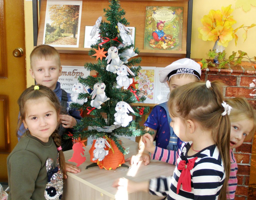 Дети и взрослые с удовольствием приняли участие в инсценировке стихотворения «Если буду я усатым». А после чтения стихотворения «Дело было в январе» дошкольники украсили ёлку бумажными зайчиками.