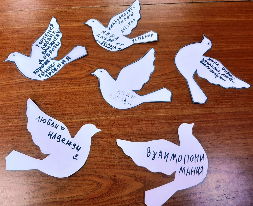 В конце встречи библиотекарь раздала главные символы праздника – бумажных голубей, на которых учащиеся написали свои пожелания.