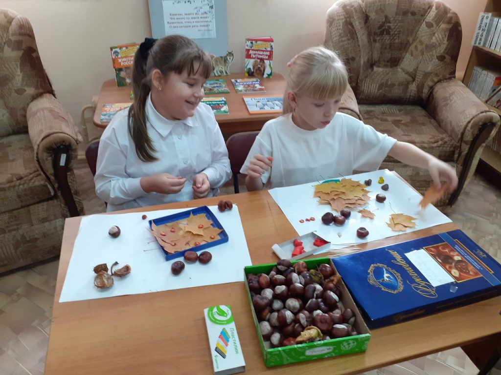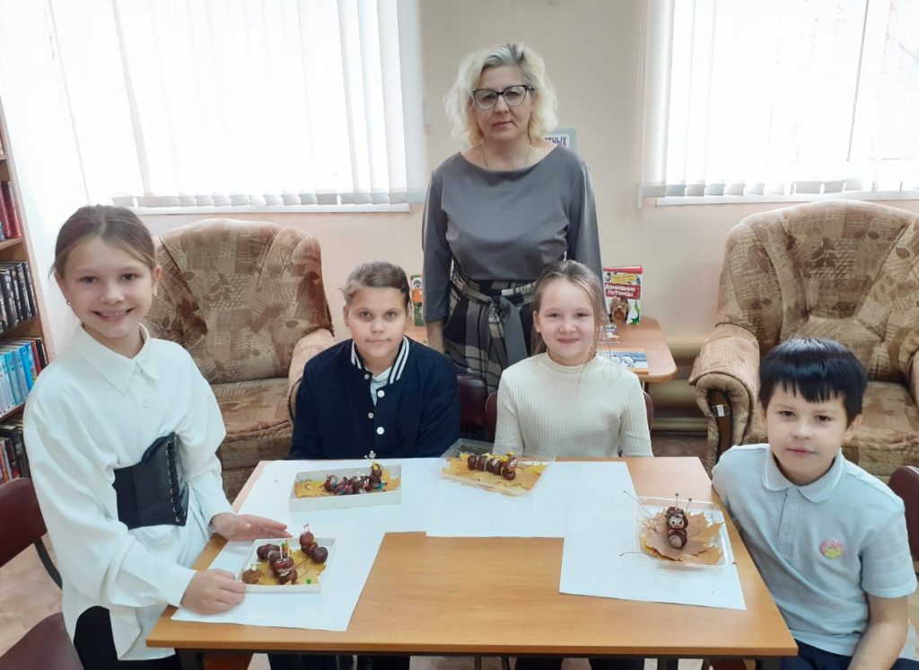 Сотрудники библиотеки и их помощники заранее заготовили шишки, желуди, плоды каштана, семена и листья деревьев для творческих работ. Под руководством библиотекаря студийцы конструировали забавных гусениц и улиток из плодов каштана, используя также пластилин.