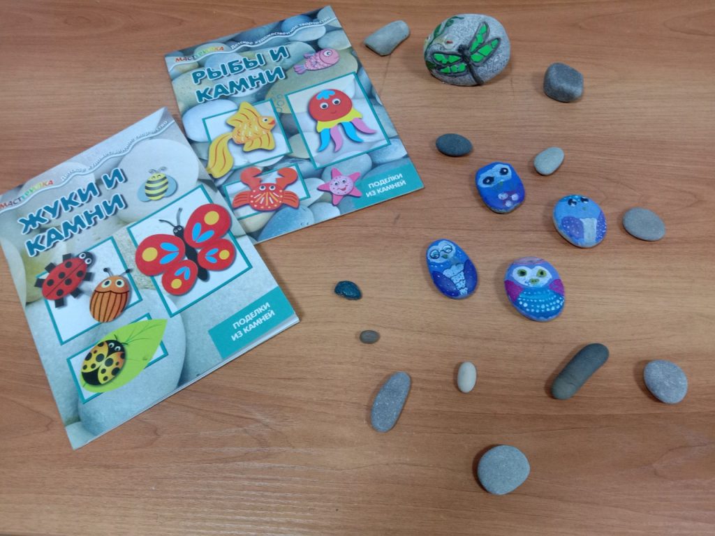 Идея рисования на морской гальке возникла во время оформления экспозиции с раковинами «Обитатели морских глубин», подаренные библиотеке читателем гладкие камни с побережья Черного моря пригодились и для детского творчества. Роспись камней шла поэтапно. Сначала ребята подбирали краски для фона, раскрашивали и сушили камни, затем карандашом наносили рисунок животного. Так в уголке детского творчества появились совушки, божьи коровки, собачки и кошечки.