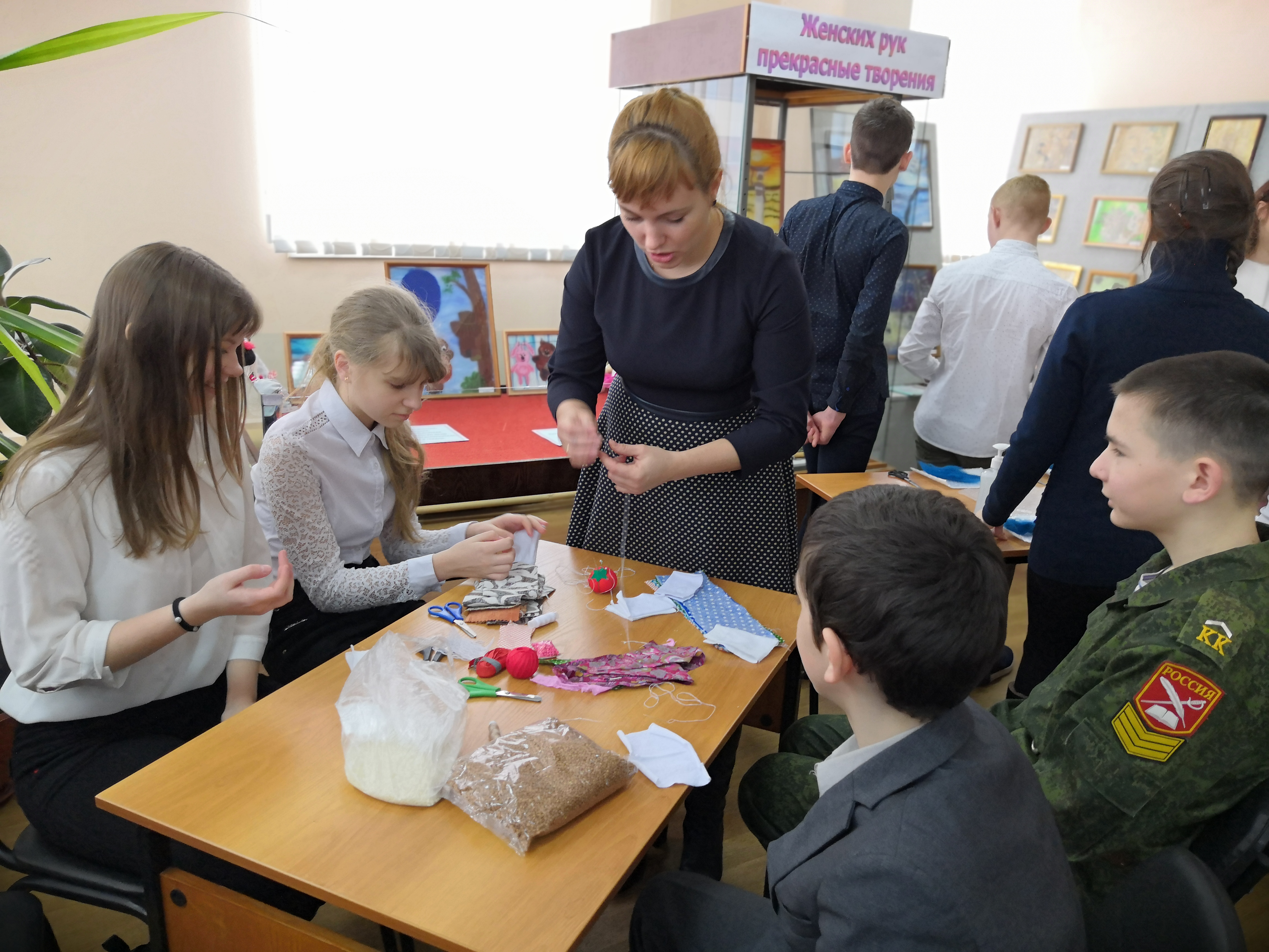 Второй группой руководила Ольга Владимировна Кулакова. Здесь школьники мастерили куклу Крупеничку. Согласно верованиям древних славян, такая кукла-оберег притягивала в дом достаток и богатство, а сейчас это прекрасный сувенир, выполненный своими руками. Всего за несколько минут из разных лоскутков ткани, ярких ниток и бусин у ребят получились замечательные куколки! На выставке школьники познакомились и с другими видами кукол.