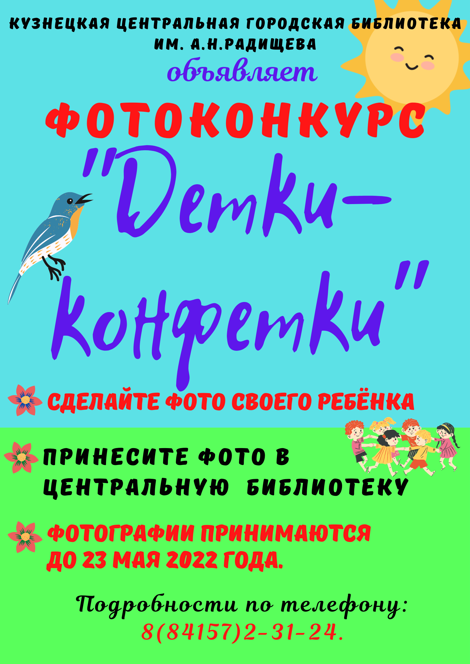 20 апреля в Кузнецкой центральной городской библиотеке им А.Н. Радищева стартует фотоконкурс «Детки-конфетки», приуроченный к Международному дню защиты детей.
