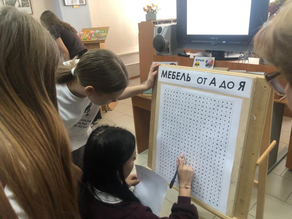 Участники с удовольствием разгадывали филворды, посвященные различным  видам мебели, а также с помощью пантомимы передавали характер различных стульев. Интересным моментом стал визуальный тест «Выбери кресло», который должен был раскрыть скрытые черты личности каждого студента. Также, по рисункам, определяли названия и назначение различных стульев и кресел.
