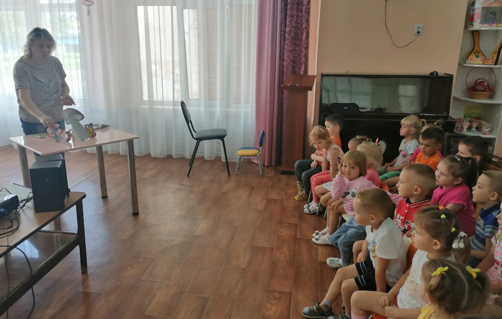 Дошкольники с интересом слушали и смотрели сказку «Под грибом» в исполнении настольного театра, внимательно следили за ходом действия. Затем была проведена игра «Путаница» с восстановлением сюжета сказки. Завершилось мероприятие просмотром мультфильма по сказке В.Г. Сутеева «Разные колёса»