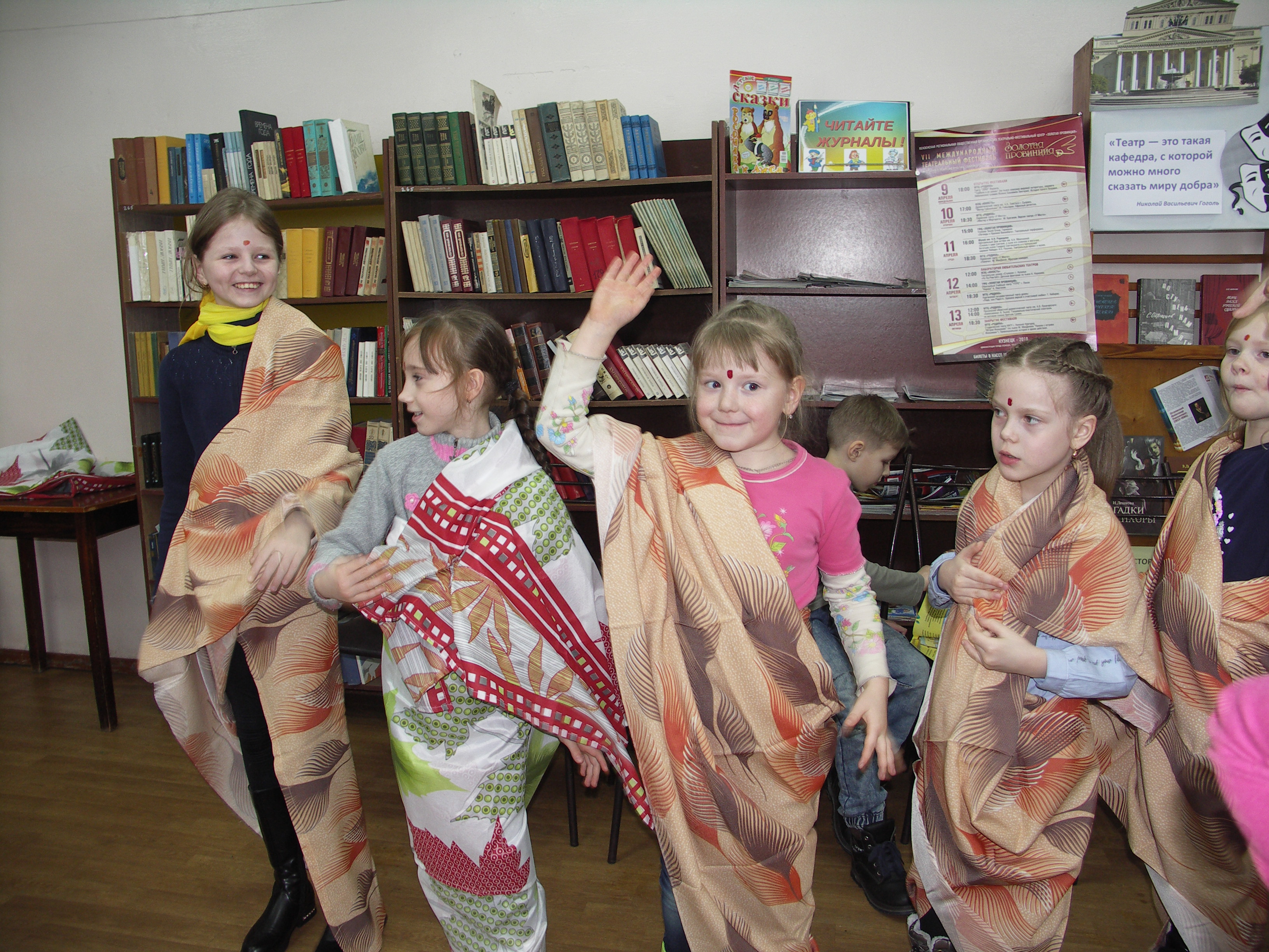 Библиотека превратилась в настоящий островок индийской культуры. Детям рассказали о многообразии традиций, о необычных праздниках и архитектурных сокровищах этой страны. С ребятами провели сеанс йогатерапии. Познакомились гости и с национальной кухней Индии, кузнецкие мальчишки и девчонки смогли по виду и по запаху различить многие специи. Кроме этого, девочки превратились в индийских красавиц, примерив на себя сари. Настоящий восторг вызвало нанесение бинди – цветной точки, которую индианки рисуют в центре лба. Ну и какая же Индия без зажигательных танцев? Девочки с удовольствием исполнили индийский танец. Все участники получили незабываемые впечатления от праздника.