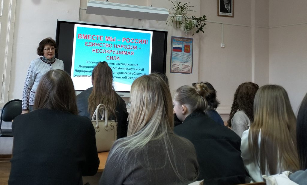 Внимание слушателей было обращено на то, что Президент В.В. Путин неоднократно выступал об историческом единстве народов России и Украины. В течение восьми лет жители регионов отстаивали своё право говорить на русском языке, добивались независимости и признания, чтобы заслужить право свободно и без вмешательства извне определять свой политический статус, осуществлять экономическое, социальное и культурное развитие. Жители Донбасса с 2014 года боролись против проявления нацизма и фашизма. Они выстрадали своё право возвращения в состав России.