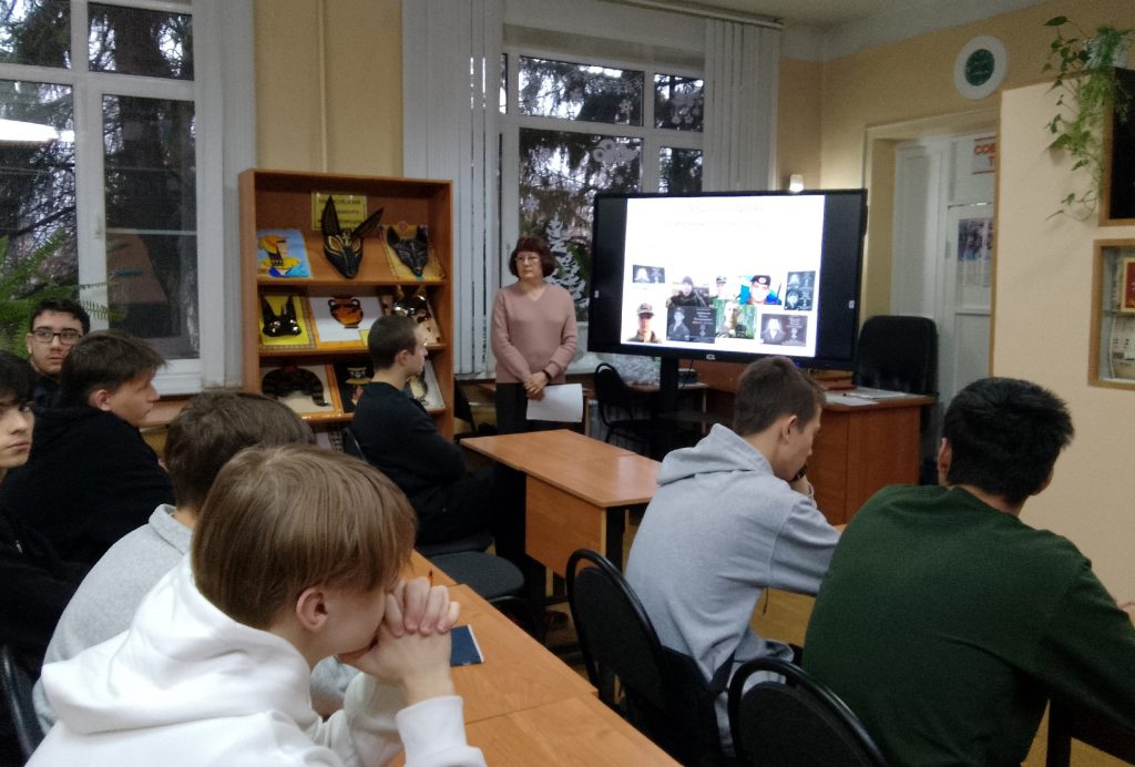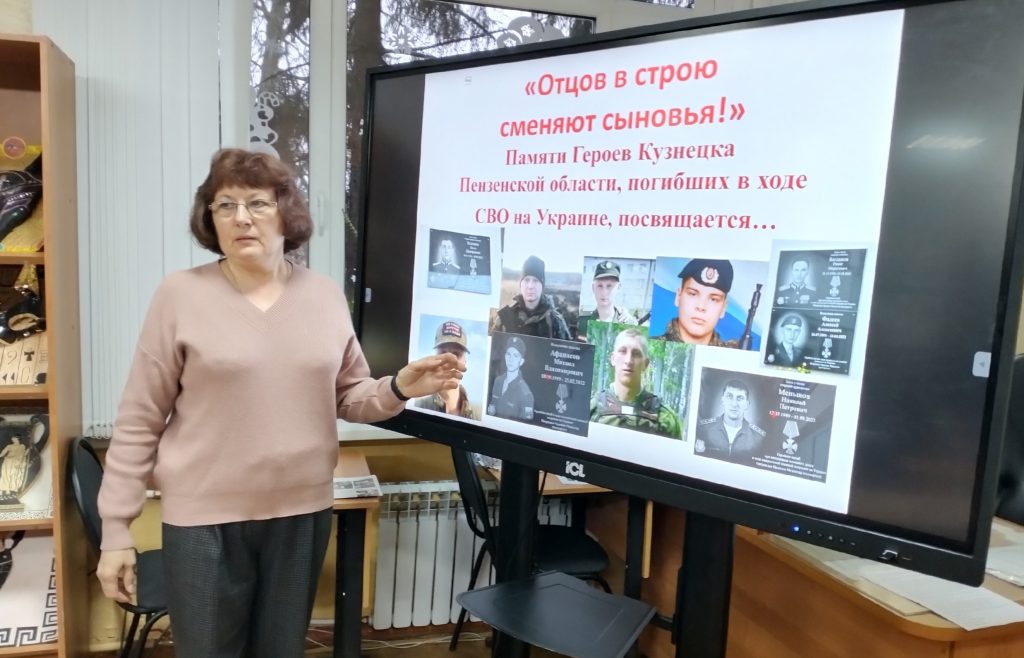 В рамках Года защитника Отечества и 80-летия Победы в Великой Отечественной войне для студентов Кузнецкого колледжа электронных технологий сотрудником центральной городской библиотеки им. А.Н. Радищева был проведён краеведческий час патриотизма «Отцов в строю сменяют сыновья…»