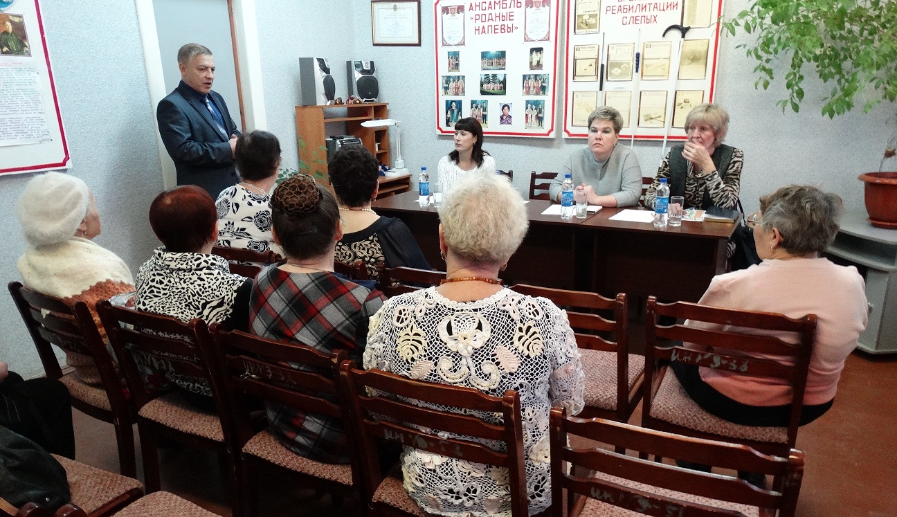 13 ноября в Кузнецкой местной организации общества слепых совместно с Кузнецкой центральной городской библиотекой им. А.Н. Радищева прошёл «круглый стол» с представителями власти: заместителем начальника управления ПФР по вопросам пенсионного обеспечения Надеждой Владимировной Уваровой , заместителем главного врача по медицинскому обслуживанию населения Шишовой Ириной Евгеньевной и специалистом Межрайонной инспекции Федеральной налоговой службы №1 по Пензенской области Граниной Екатериной Викторовной.
