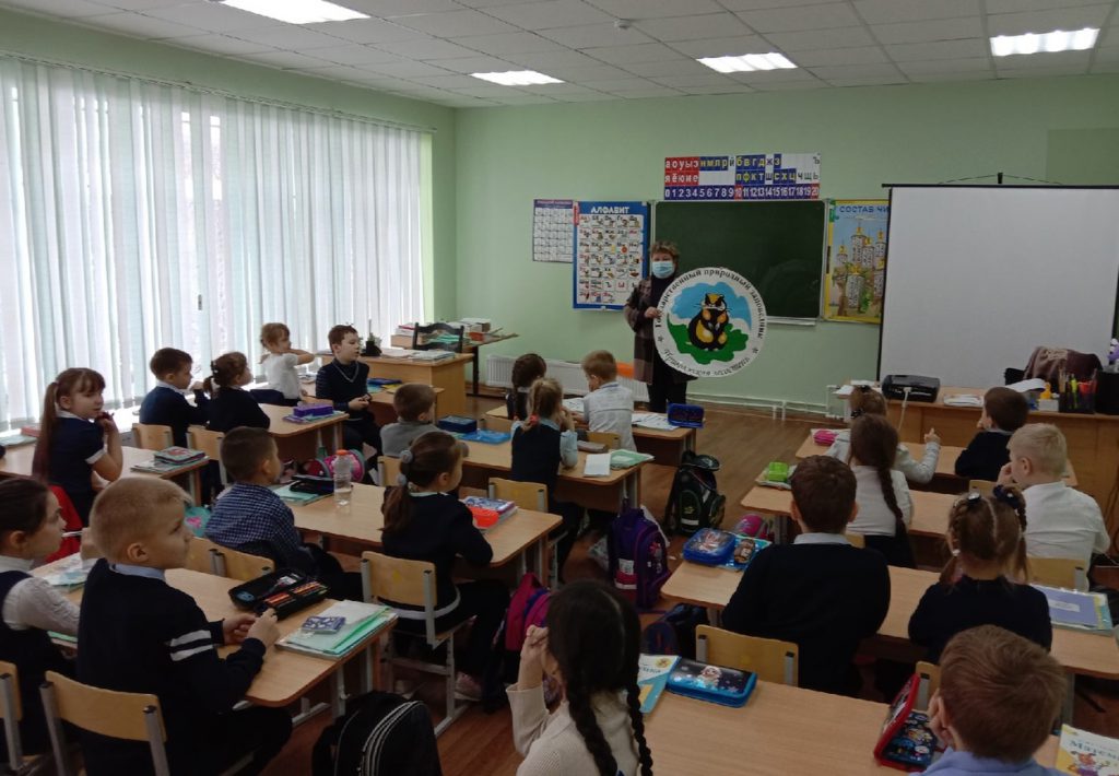 Сотрудники библиотеки-экоцентра в рамках социально-экологической акции «Марш парков – 2021» знакомят первоклассников с представителем заповедной фауны – степным сурком.