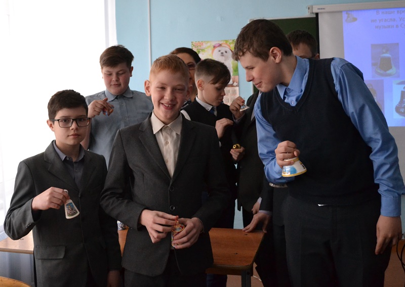 Ребят удивили истории о том, что колокола наказывали, как живые существа: у них вырывали язык, лишая их голоса, пороли плетьми, отправляли в ссылку, а некоторым давали имена — Сысой, Лебедь, Баран, Реут… Школьники познакомились с историей создания самого большого колокола в мире — Царь-колокола, слушали колокольные звоны, смотрели видеоролик о музее колоколов в г. Касимов и звонили в настольные колокольчики.