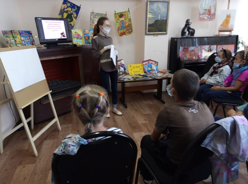 Юношескую библиотеку посетили ребята из летнего лагеря села Комаровки. В литературной гостиной их встречали коты, кошки и котики разных мастей. Этих забавных и милых, независимых животных нарисовали в разные годы ученики художественной школы.