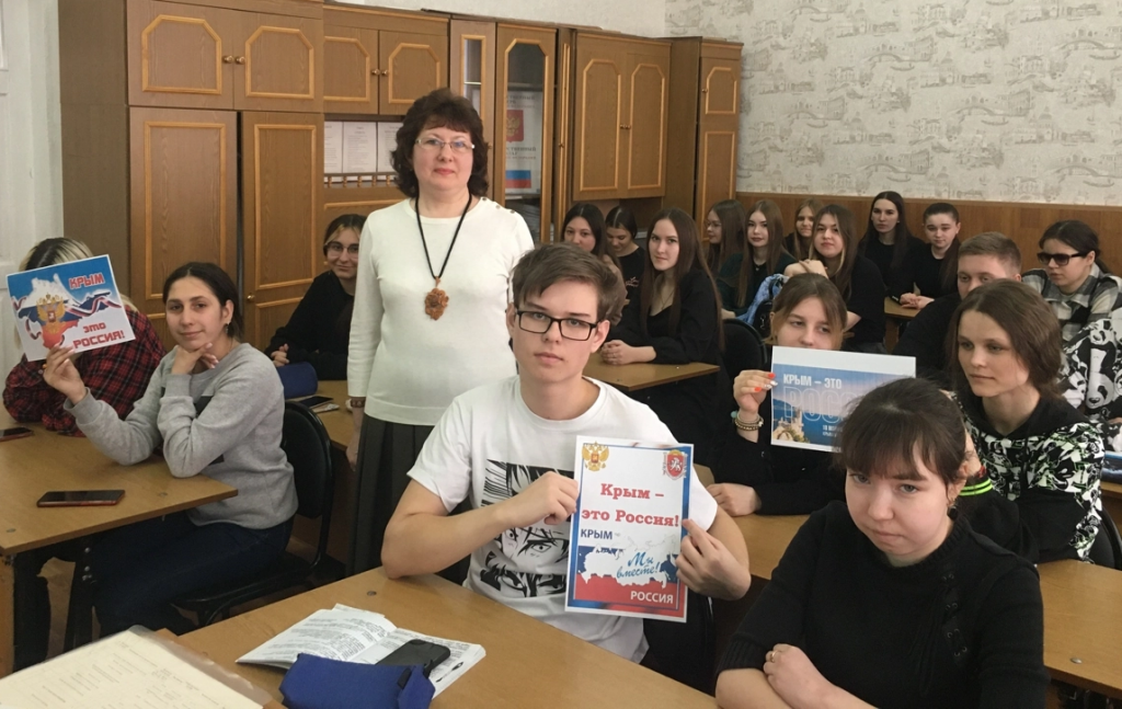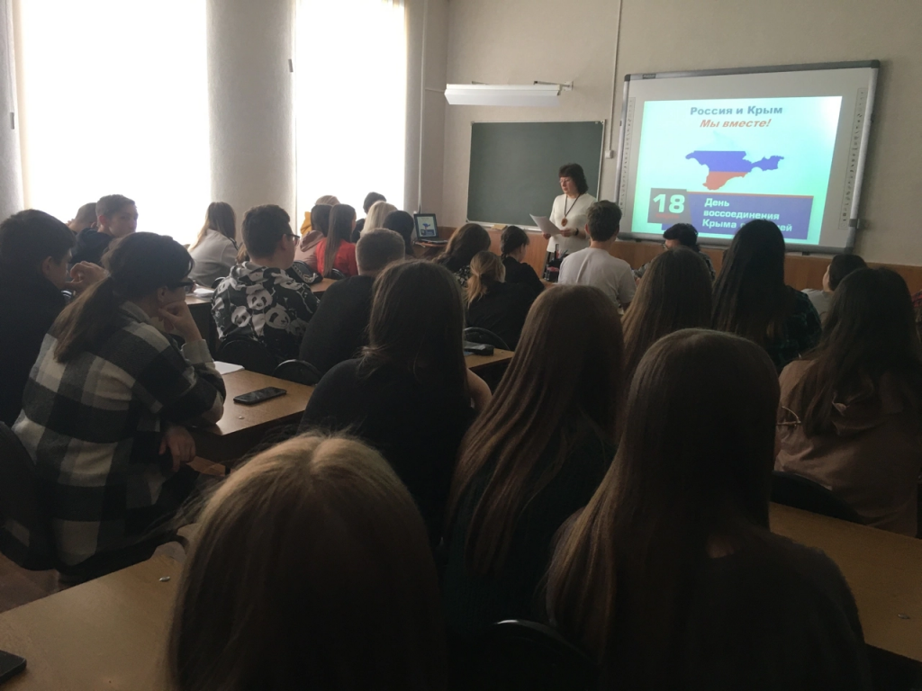 17 марта, в преддверии Дня воссоединения Крыма с Россией, для студентов Кузнецкого многопрофильного колледжа прошёл патриотический час «Мы вместе!».