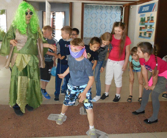 Библиотекари пригласили детей из летних лагерей при школах № 6, 10, 15 отправиться на  поиски волшебного клада.  В пути ребят ждали захватывающие приключения, опасные препятствия, встречи с необыкновенными героями. Добрая Волшебница пригласила детей в сказку и была очень рада тому, что они хорошо знают сказочных героев. От  радости она даже пустилась в пляс вместе с ребятами.  Хитроумный детектив предложил мальчишкам и девчонкам попробовать себя  в роли сыщиков и был поражен их знаниями, внимательностью и сообразительностью. Надолго запомнится юным путешественникам знакомство с лесной Кикиморой. За помощь в уборке мусора в лесу она угостила детей своими фирменными блюдами, которые можно было попробовать только с завязанными глазами.