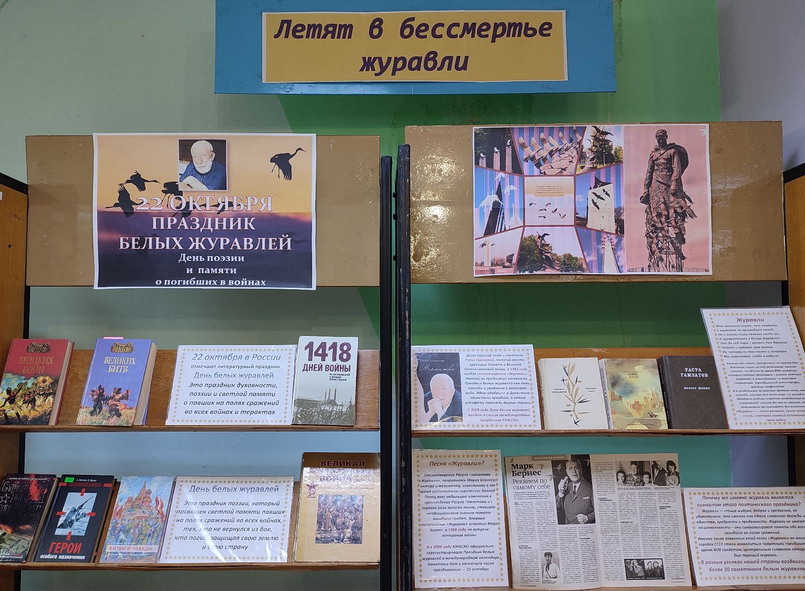 На выставке «Летят в бессмертье журавли» представлены документальные книги о войнах, великих битвах, а также сборники стихов известных поэтов, в том числе Р. Гамзатова, песни войны и победы. Ярким дополнением к книгам и журнальным статьям являются цветные фотографии памятников, посвящённых погибшим героям.