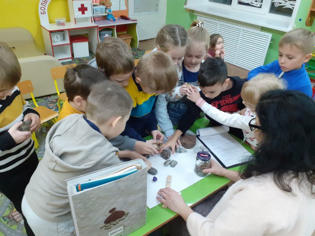 Малыши на время занятий превратились в ученых импровизированной мини-лаборатории. Они провели исследования камней по цвету, форме, размерам, также определяли, какие камни гладкие, а какие — шероховатые. Юные исследователи размышляли, рассуждали, делали свои выводы о свойствах камней. На примере гранита и мрамора они узнали об использовании камней в строительстве, рассматривая опал и нефрит – о существовании драгоценных минералов.