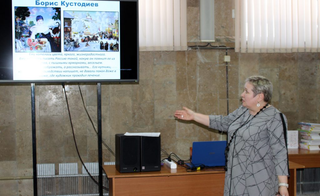 О жизни и творчестве Бориса Кустодиева, живописца с нелегкой судьбой, рассказала библиотекарь Татьяна Юрьевна Военкова. Свои лучшие картины художник написал будучи прикованным к инвалидному креслу.