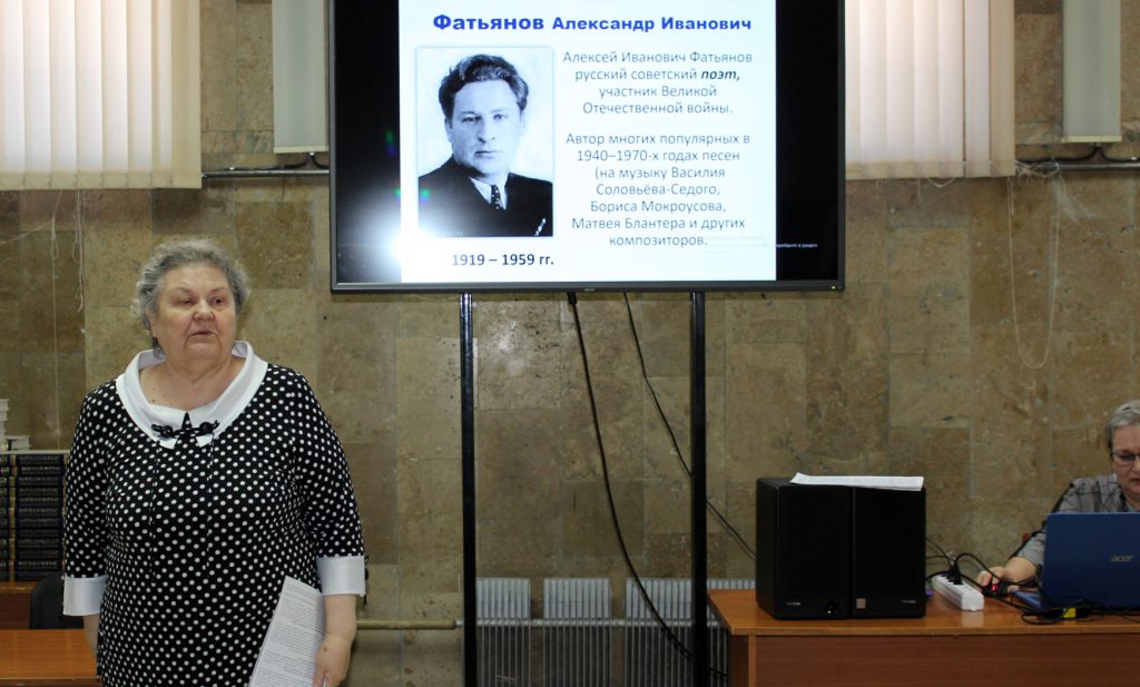 Рассказ о поэте Алексее Фатьянове сопровождался исполнением песен на его стихи. «В городском саду играет», «Когда весна придет, не знаю» – эти песни собравшиеся пели «вместе» с Геннадием Беловым и Алексеем Рыбниковым.