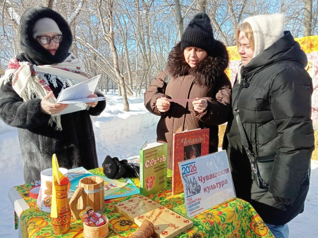 На Масленице читали сказки А.С. Пушкина и стихи А.Л. Барто на чувашском, а самые смекалистые отгадывали хитромудрые чувашские загадки. Здесь можно было полистать русско-чувашский словарь, посмотреть миниатюрные куклы в национальных костюмах, узнать значение чувашских рун, подержать в руках берестяной рожок пастуха и просто пообщаться на чувашском языке.