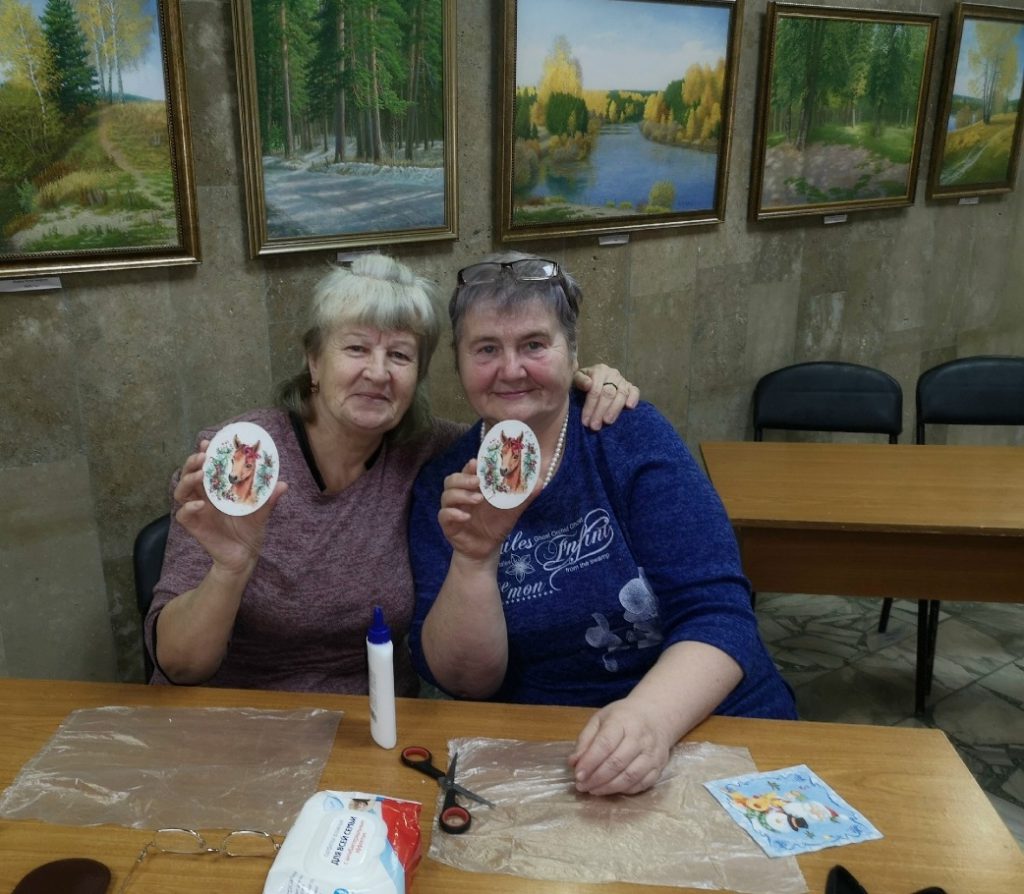 Эта старинная техника вновь стала модной в наши дни. Её используют при декорировании сумочек, шляпок, шкатулок, посуды, при оформлении одежды, модных аксессуаров, а также при создании эксклюзивных предметов интерьера. Сейчас к традиционной технике добавился декупаж из салфеток, из тканей, на тарелочках и разделочных досках. Этим видом рукоделия и решили заняться мастерицы серебряного возраста, проявив фантазию и изготовив чудесные сувениры новогодней тематики. Их умелыми руками были созданы красивые и неповторимые тарелочки, шкатулки, вазочки, разделочные доски с цветами, свечами, снеговиками, а также с символом Нового года – Огненной Лошадью.