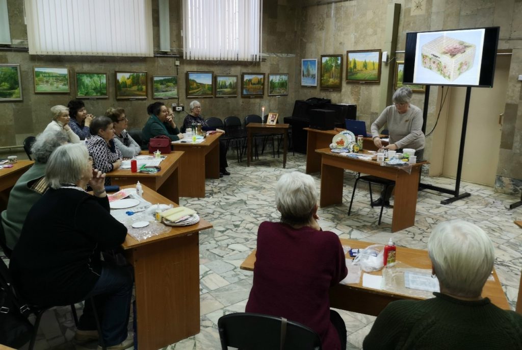 Председатель клуба «Гармония» Ирина Анатольевна Расторгуева рассказала собравшимся в зале рукодельницам о технике вырезания ажурного изображения и декоративного приёма деколлажа по принципу переводной картинки. Окунувшись в историю декупажа, мастерицы узнали много интересного о художественном приёме игры фигуры и фона изображений, восходящем к раннему Средневековью.