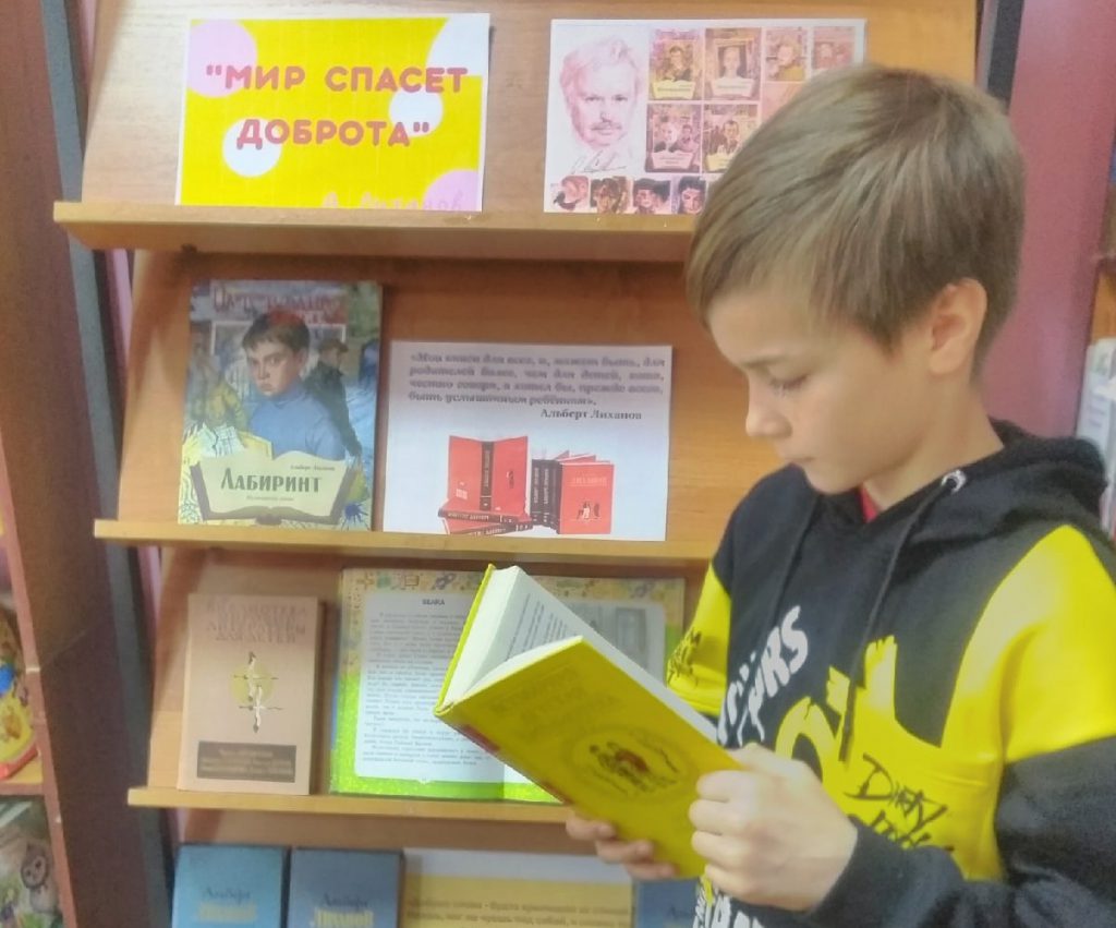 На детском абонементе работает книжная выставка «Мир спасёт доброта», посвящённая творчеству писателя. Для юных посетителей библиотекари подготовили интерактивную викторину по произведениям А.А. Лиханова. Повести писателя «Мой генерал», «Крутые горы», «Последние холода», «Сломанная кукла» и другие привлекают ребят тем, что главными героями являются их ровесники, которые, оказавшись в трудных условиях, вели себя как взрослые люди. Понравившиеся книги с выставки мальчишки и девчонки берут домой.