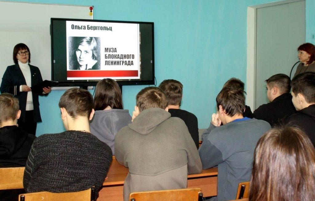 Для первокурсников Кузнецкого колледжа электронных технологий сотрудники юношеской библиотеки провели встречу, посвященную поэтессе Ольге Берггольц. Участникам встречи был представлен видеофильм «Я говорю с тобой из Ленинграда», рассказывающий о трудной, переплетенной с войной судьбе поэтессы, о работе на ленинградском радио, о творчестве в блокадном городе.