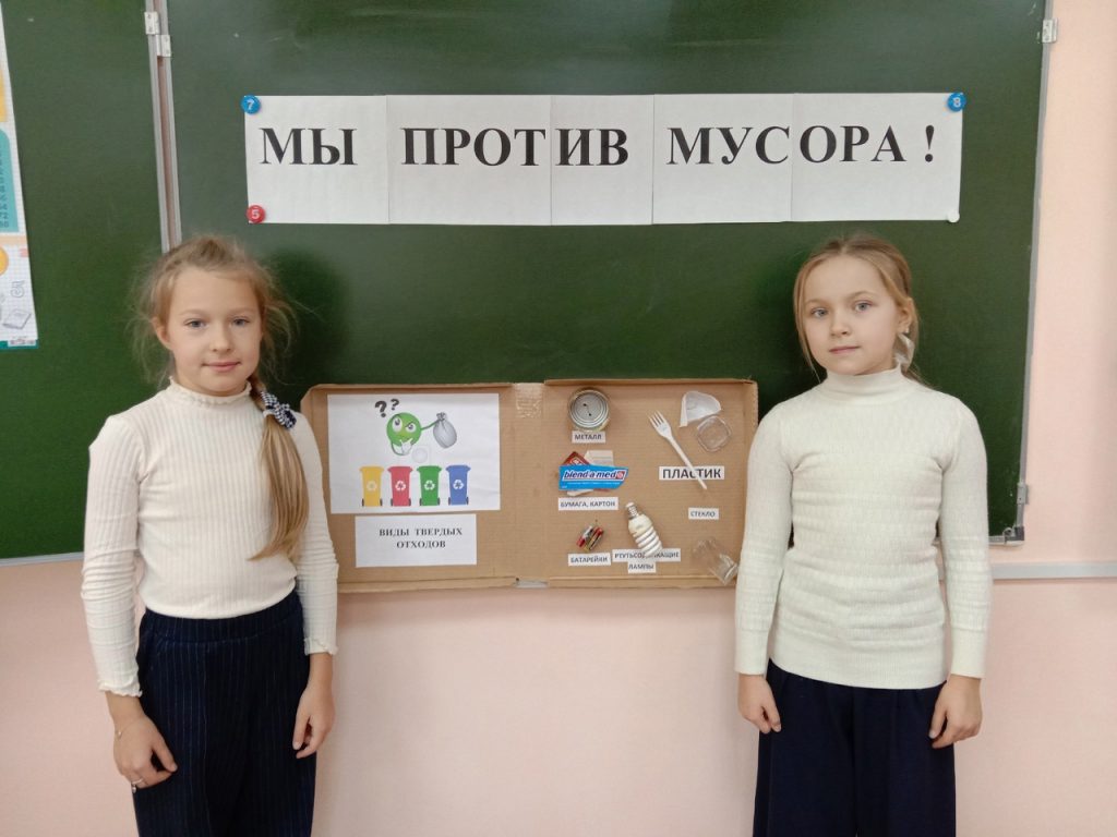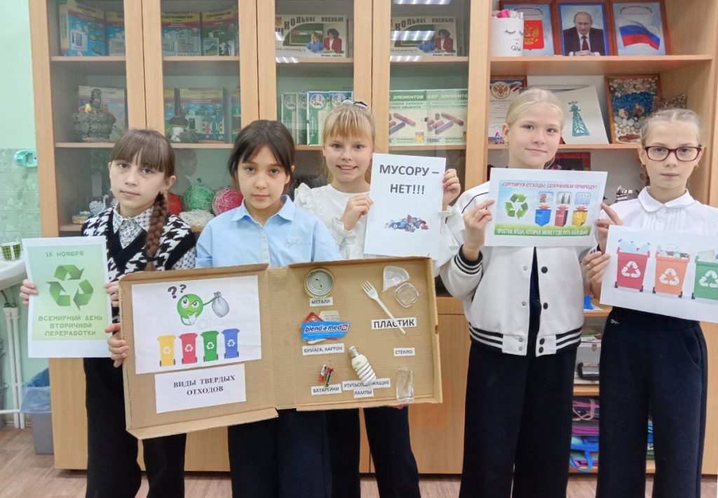 Школьники на часе экологии «Мусор: минусы в плюсы» смотрели ролики о раздельном сборе мусора, разбирали разные экологические ситуации, предлагали свои варианты по уменьшению мусора в городе. Активисты классов делились опытом сбора макулатуры, отработанных батареек, использования пластика в конструировании разных полезных вещей.