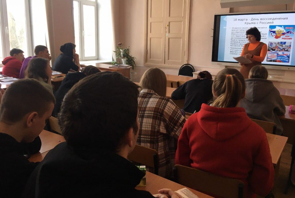 18 марта, в День воссоединения Крыма с Россией, сотрудники центральной городской библиотеки им. А.Н. Радищева провели для первокурсников Кузнецкого многопрофильного колледжа патриотический час «Мы вместе!».