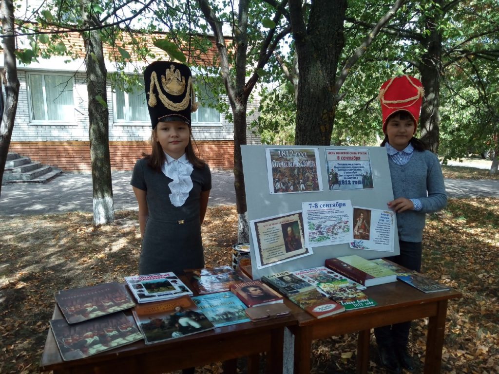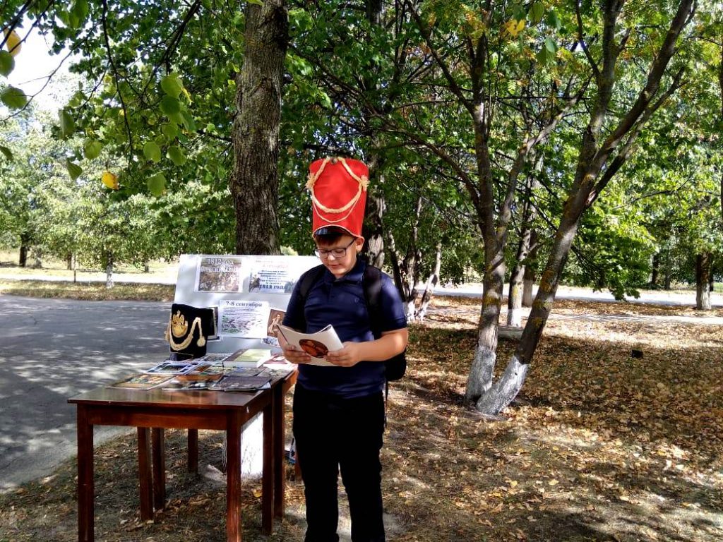 Ребятам напомнили о самой ожесточенной битве Отечественной войны 1812 года. Русская армия во главе с великим полководцем М.И. Кутузовым и народное ополчение отстояли честь и независимость своей страны, уничтожили армию Наполеона. Участники конкурсной программы вспоминали имена полководцев, народных героев Отечественной войны 1812 года, называли виды вооружения русской армии, обмундирование солдат. Все участники патриотического мероприятия вслух читали стихотворение М.Ю. Лермонтова «Бородино». Каждый мог примерить кивер – головной убор солдата русской армии и сфотографироваться.