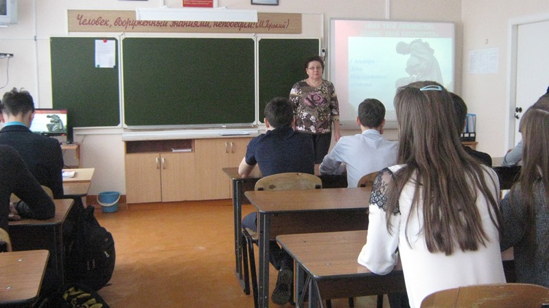 Сегодня вспоминали безымянных героев, защитников Отечества, погибших в годы Великой Отечественной войны, известных под именем «Неизвестный солдат», которые сложили голову во имя Отчизны, но не сложили оружия, стояли и воевали до последнего вздоха. Лишь немногим героям удаётся вернуть имена, остальные так и остаются «неизвестными солдатами». В память о них в 2014 году 3 декабря объявлен Днём Неизвестного солдата, поскольку именно 3 декабря 1966 года в ознаменование 25-летней годовщины разгрома немецких войск под Москвой прах неизвестного солдата был перенесен из братской могилы на 41-м км Ленинградского шоссе в Александровский сад и там торжественно захоронен. Об этом событии ребята посмотрели короткий фильм. Школьники узнали об открытии мемориального комплекса «Могила Неизвестного солдата» у стен Кремля. Во время часа памяти прозвучало стихотворение Э. Асадова, возвращая мысленно всех присутствующих к страшным страницам Великой Отечественной войны. Сколько их, неизвестных солдат, сложили свою голову, защищая Отечество? Не сосчитать! Минутой молчания школьники почтили память всех погибших на войне.