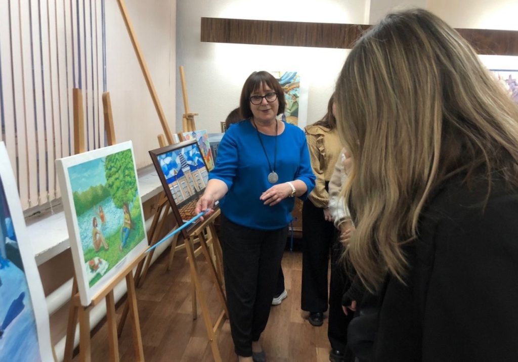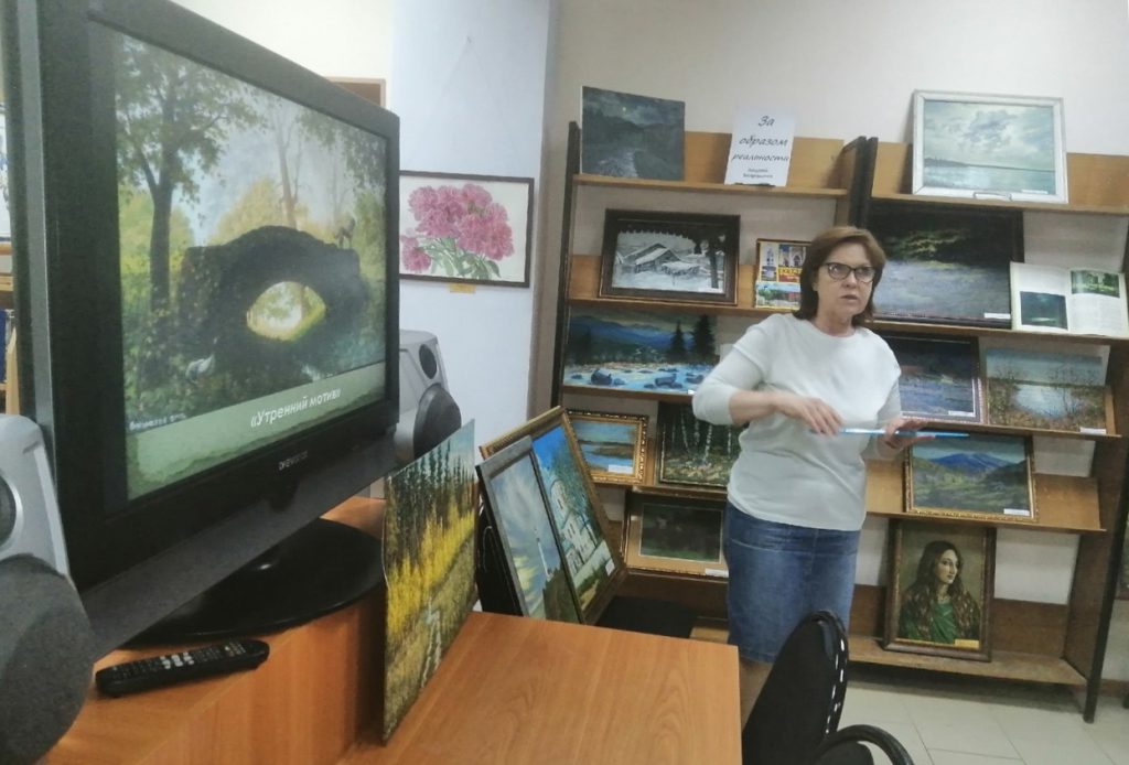 Экскурсия началась с выставки художниц нашего города. Здесь представлены работы, написанные в разных жанрах и стилях, представляющие академическую и классическую, а также современную живопись. Лейтмотив выставки: в картинах женщин-художниц нет места конфликтам и противоречиям — только любовь, гармония и простота.