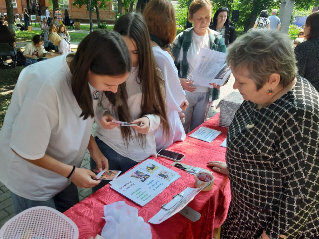 На площадке «Библиотека грамотности» говорили о «великом и могучем», ведь 6 июня ещё и День русского языка. Дети и взрослые разгадывали по нарисованным нейросетью картинкам фразеологизмы. Желающие написали экспресс-диктант и проверили грамотность,