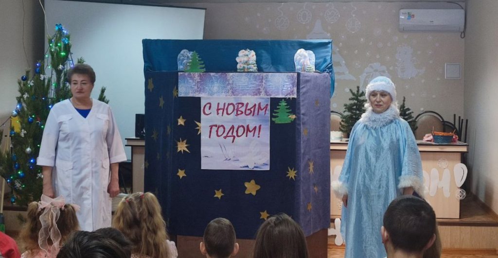 Больше сорока детей приняли участие в новогоднем театрализованном представлении «Сказка под ёлочкой». Всех с наступающим Новым годом поздравила главный врач больницы Галина Петровна Дерябина. Сотрудники библиотеки показали кукольный спектакль «Новогодняя сказка». Во время представления сказочные герои загадывали детям загадки, дети играли и соревновались, переживали за судьбу Снегурочки, ребята были готовы идти на помощь.