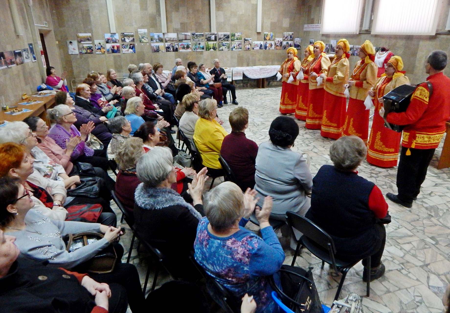 А потом в выставочном зале «загорелось» яркое весеннее солнышко, хотя денек и выдался хмурым. Это появился в зале ансамбль «Кузнечаночка». Руководит коллективом Елена Елина, хормейстер — Абрамов Николай Васильевич. Мастерицы швейного цеха В.Е.Ильдейкиной более года назад создали свой песенный ансамбль, когда в 2016 году надо было защитить честь города на областном конкурсе художественной самодеятельности среди трудовых коллективов. Стала «Кузнечаночка» и лауреатом фестиваля «Золотые россыпи России» в 2017 году. Не только красотой и профессионализмом исполнения народных песен, обрядов поражает ансамбль. Прекрасны и костюмы, выполненные золотыми руками мастериц и песенниц. Мелодичные и протяжные народные напевы внесли нотку легкой грусти в зале, а звонкие, веселые, озорные песни заставили всех радостно улыбаться. Каждая песня в исполнении «Кузнечаночки» получала в подарок бурные аплодисменты собравшихся. Около часа продолжался великолепный концерт. Члены клуба «Гармония» искренне благодарили Веру Егоровну Ильдейкину, ансамбль «Кузнечаночка» за интересный рассказ, за радость и тепло, которое они доставили собравшимся.