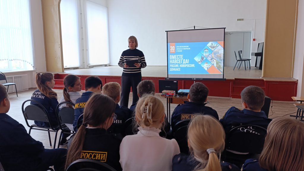 Сотрудники краеведческой библиотеки провели для учащихся школы № 10 информационный час «Мы вместе!», приуроченный Дню воссоединения России и ДНР, ЛНР, Запорожской и Херсонской областей.
