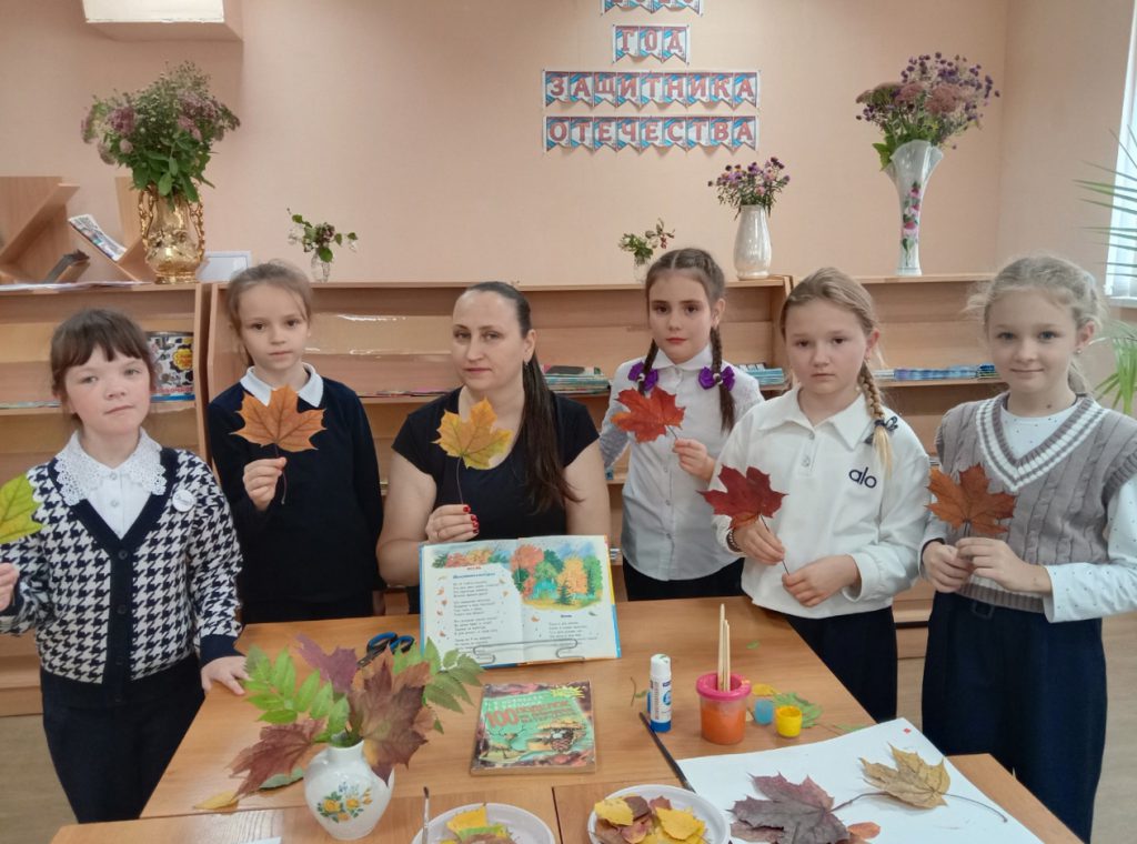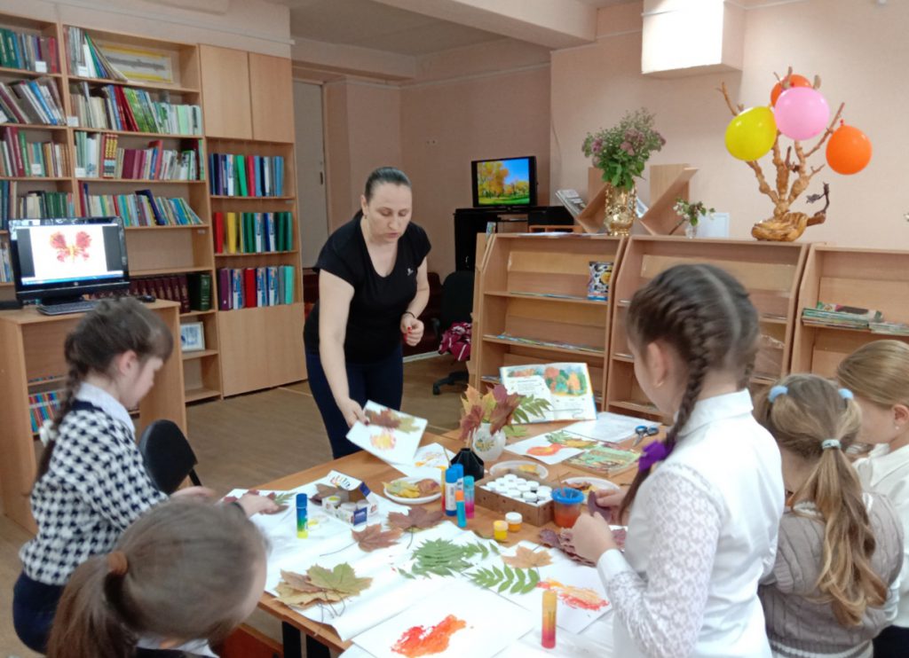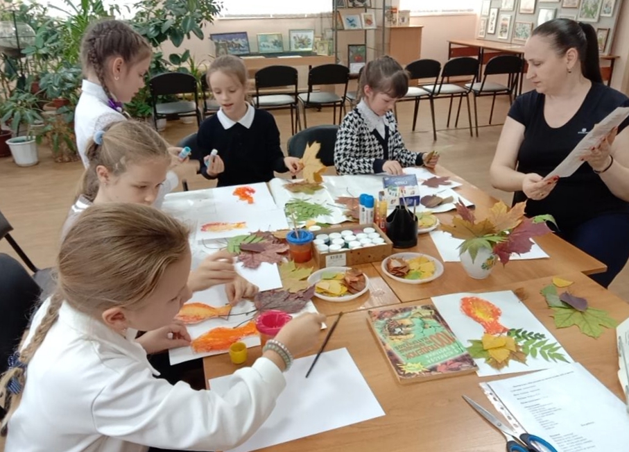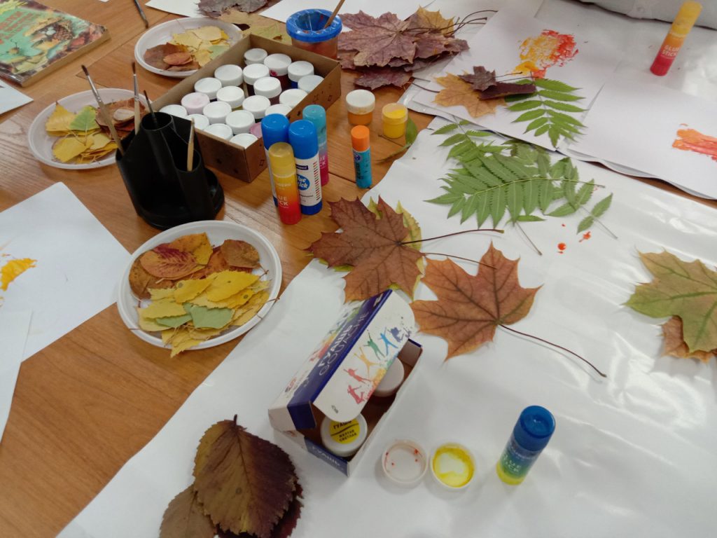 Участники творческой студии «Родничок» при библиотеке-экоцентре занимались составлением аппликаций из осенних листьев.